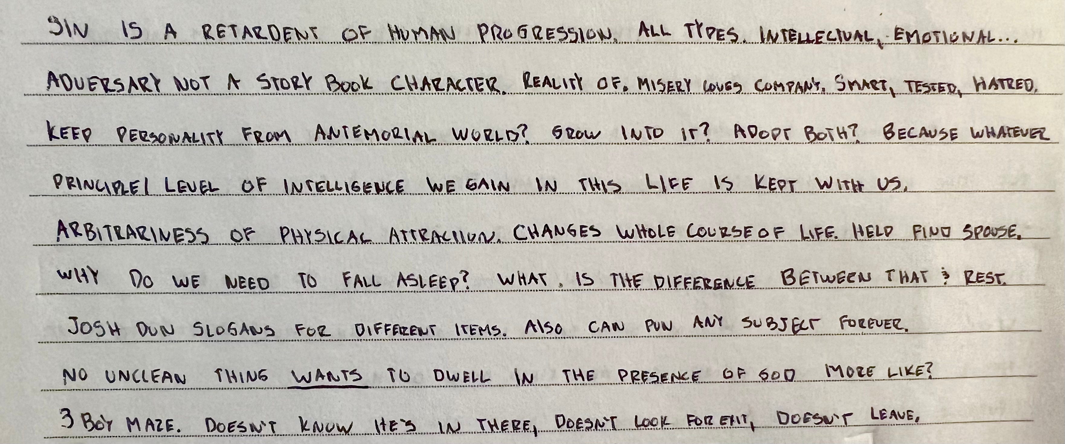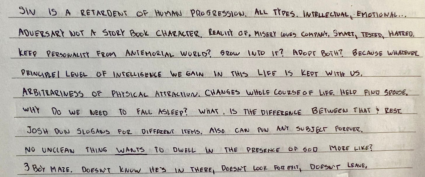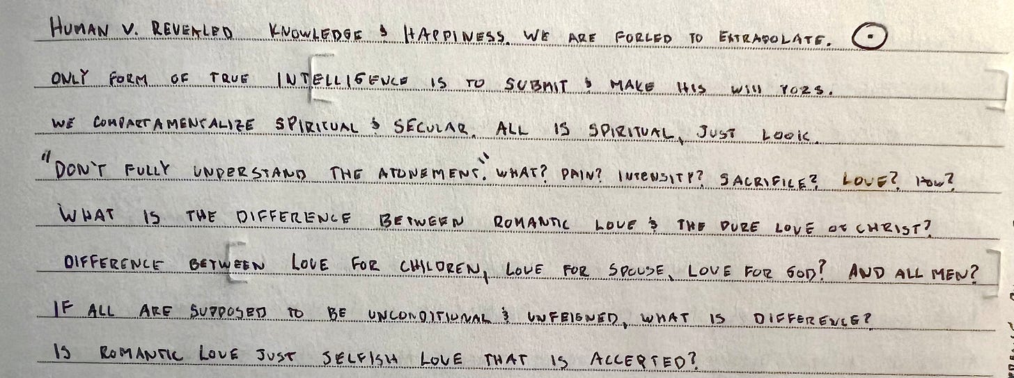In the same way that I used to disappear into my notes app in high school, I started to retreat from the real world into my own mind. Whenever we got home from a long day of missionary work, I would spend the next hour before bed obsessively documenting the thoughts that I had throughout the day in my journal. I would write down (what I thought were) incredibly deep, philosophical questions and observations, but never actually took the time to explore or answer any of them, because my brain was too busy immediately bouncing on to the next great idea.