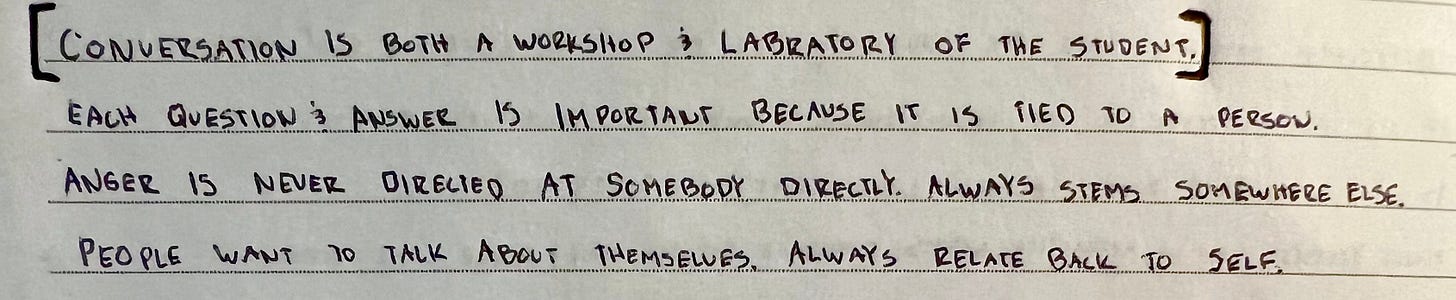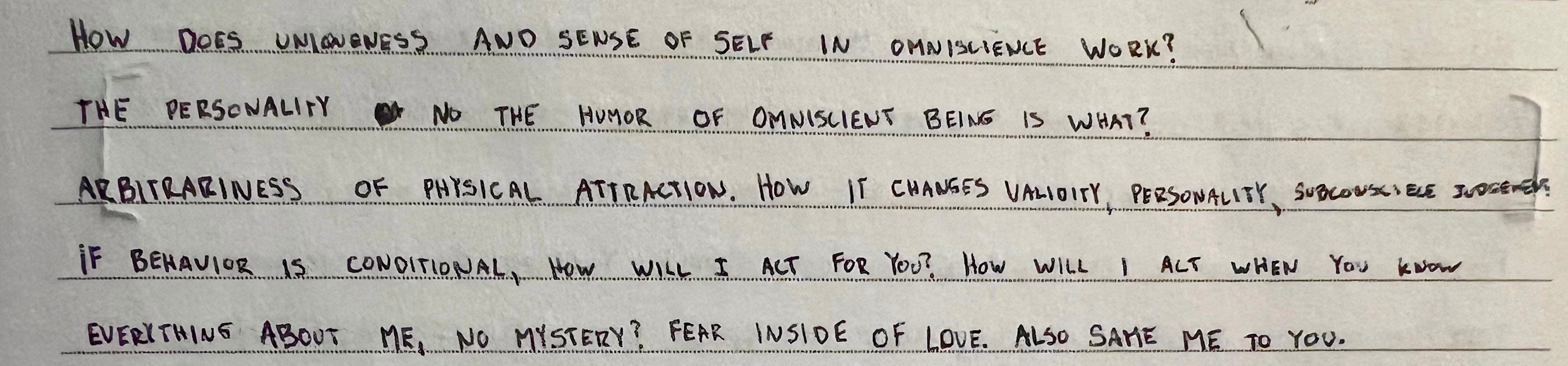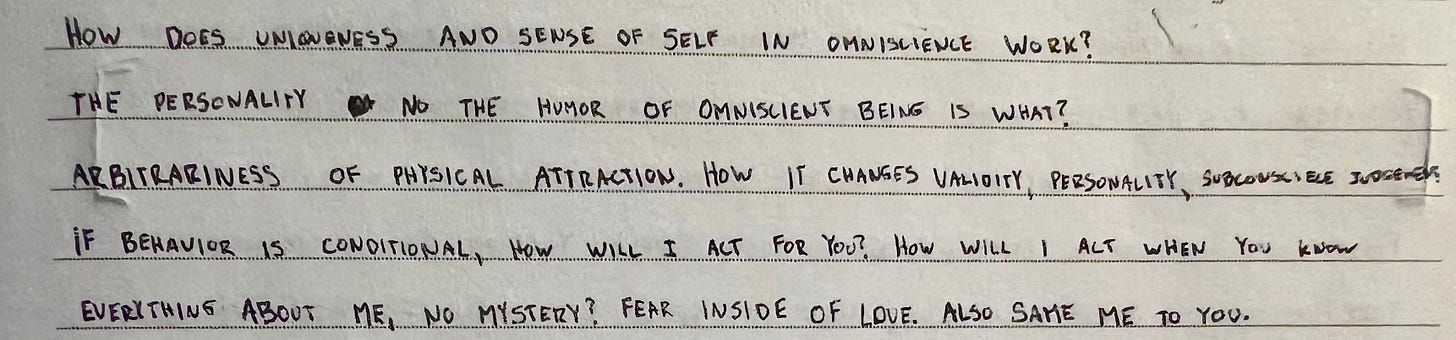 I spent most of my High School life in the notes app on my phone incessantly writing down whatever thoughts came into my head. I’d have intense, 30 minute, sometimes several hour-long bursts of heightened mental activity where I felt deeply creative - like every thought and connection I was making was meaningful. Intellectual creativity felt like a flow state where time was distorting around me - simultaneously moving both faster and slower than normal. I never actually went back and read most of my notes, but nonetheless I was obsessed with making sure I documented everything I was thinking.