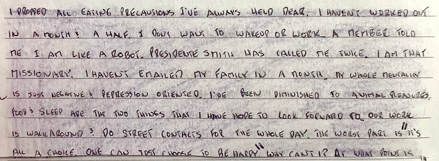 I wrote down most of the philosophical, or intellectual thoughts I was having, but I was pretty trepidatious to write about anything associated with my emotions or lived experience. Like I said, Mormon missionaries are told that as agents with free will, their emotional states are a choice, and to feel “sad” or “anxious” is to be actively choosing darkness instead of light. I wanted to be a good missionary, so I told myself the story that I was having a great time, the mission was so fulfilling, and serving the Lord made me happier than anything else ever could.