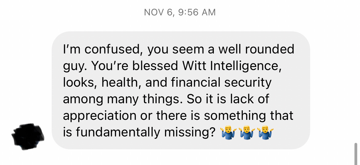 2. I don’t get approached a lot in public, but I get approached often enough to know that there’s a non-zero amount of people out there that care about and resonate with my content. I’m not claiming this is representative of my typical follower, but I’m reminded of one girl in particular that approached me one time at the gym. She didn’t tell me her life’s story, but it was just so obvious that she’d fucking been through it. She was clearly super nervous to approach me, afraid to make eye-contact, and was just like, “Hey, I don’t want to interrupt your workout, but I love your content and I follow you on everything, do you mind if I get a picture?” I said of course, we took a snapchat selfie, and then she walked away. There probably isn’t many, but I feel like I owe people like her an explanation and an apology. I’m sorry.
