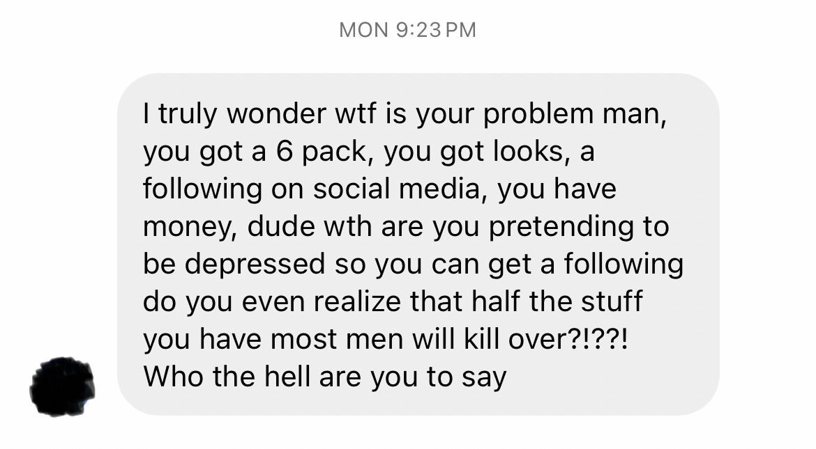 Anytime I tried to express my pain at home I was told to shut up and be a peacemaker. Anytime I tried to express my pain to my friends they would get uncomfortable and immediately change the subject. Every last authority figure in my life either didn’t give a shit, or told me to read the scriptures so that God could take the pain away. Anytime I tried to express my pain through humor online some dumb fucking cunt would say, “What could you possibly have to be sad about?” or “Don’t you realize other people would kill to have what you have?” or “You’re a attractive, grew up with money, and have social media followers, shut up and quit complaining, you don’t know what it’s like to actually suffer”.