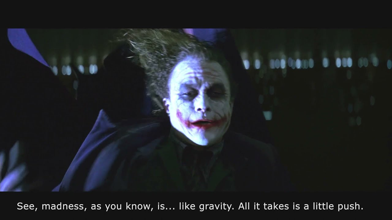 To them you’re just a freak. Like me! They need you right now, but when they don’t, they’ll cast you out. Like a leper! See their ‘morals’, their ‘code’, it’s a bad joke. Dropped at the first sign of trouble. They’re only as good as the world allows them to be. I’ll show ya, when the chips are down these... ‘civilized people’? They’ll eat each other. See I’m not a monster, I’m just ahead of the curve.